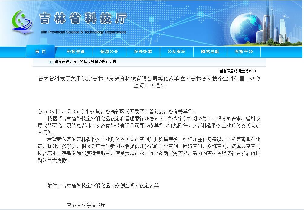 根據《吉林省科技企業孵化器認定和管理暫行辦法》(吉科火字[2008]62號),經專家評審、省科技廳黨組研究,吉林中友教育科技有限公司被認定為為吉林省科技企業孵化器(眾創空間)。以下為吉林省科技廳發布的通知!